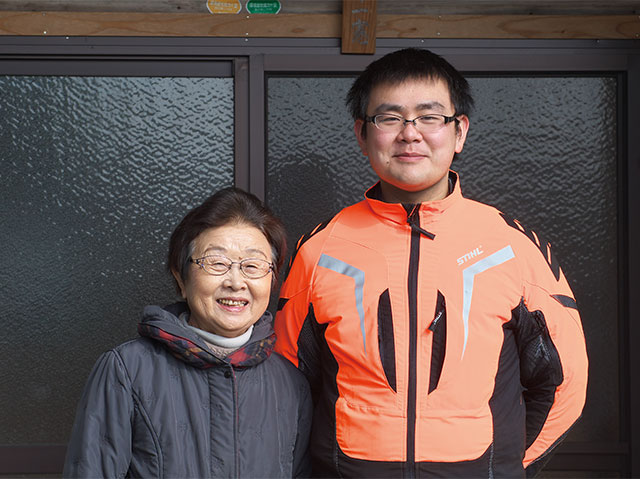 静岡で会社員をしていた時に体を壊し「そんな働き方をするくらいならば、じいちゃんとばあちゃんの山仕事を手伝いに産山に来なっせ」と祖母の酒井郁子(さかいいくこ)さんから話があった。祖父、酒井一憲(さかいかずのり)さんは元森林組合長。産山村では有名な地主さんで、大規模な椎茸生産もされ、昔は一憲さんが木を伐り、郁子さんが林内車を操作したりなど、ご夫婦で山仕事をされて来た。