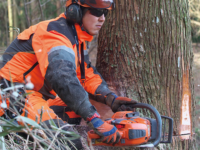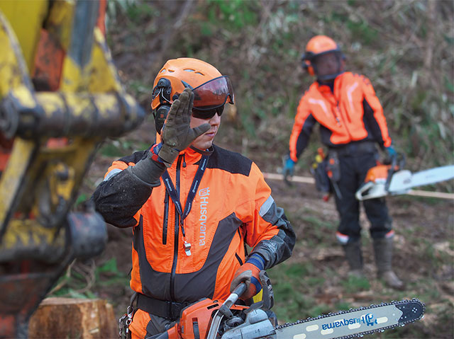 阿蘇市にある後藤林業のいわゆる若旦那、後藤 亮さん(35)は、林業歴14年目。現場に到着すると、冬景色の中に、後藤林業さん若手お二人の防護服の鮮やかな蛍光オレンジ色が目に飛び込んできた。「防護服、決して安くはないです。しかし、私たち林業者の最大の資産は、機械ではなく”自分自身“なので、安全のため、格好良さのためにお金をかけることは、林業者にとって最大の投資だと思います。森も大事にしていますが、人も大事にしています。」