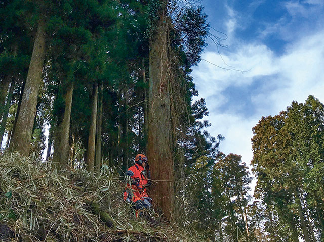 現場では「自分が納得した仕事をする。」伐ってもお金にならない雑木でもきれいに伐ったりする。見た目も大事。「自分はA型なので、気になったら、納得しないと終われないんです。」「大きなことは言いませんし、気負いせずにやっていますが、自分が日々淡々とやっていることが結果的に阿蘇の自然のためになっている、というのはうれしいです。」